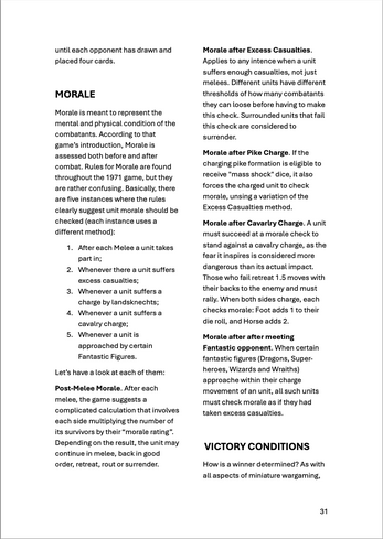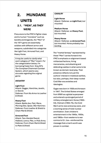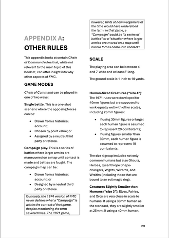 In 1971, Gygax authored a medieval miniatures war-game with Jeff Perren. The fantastic medieval campaigns game of 1974 pretty much required the use of the 1971 miniatures game. Because of this, FMC offers a “semi-abridged” version of that earlier game as an appendix called Chain of Command.